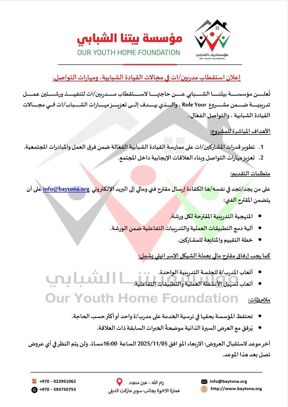 إعلان استقطاب مدربين/ات في مجالات القيادة الشبابية، ومهارات التواصل.
