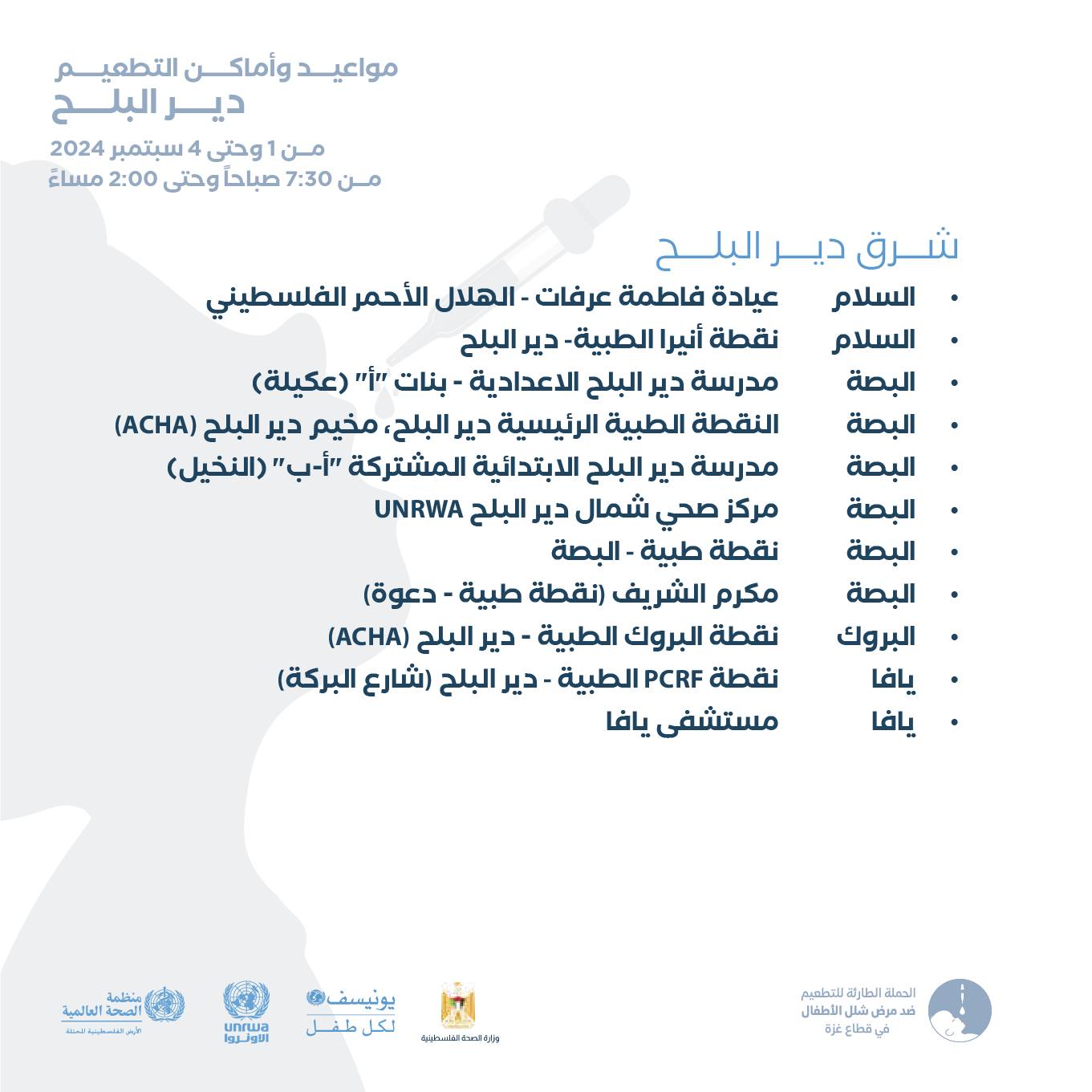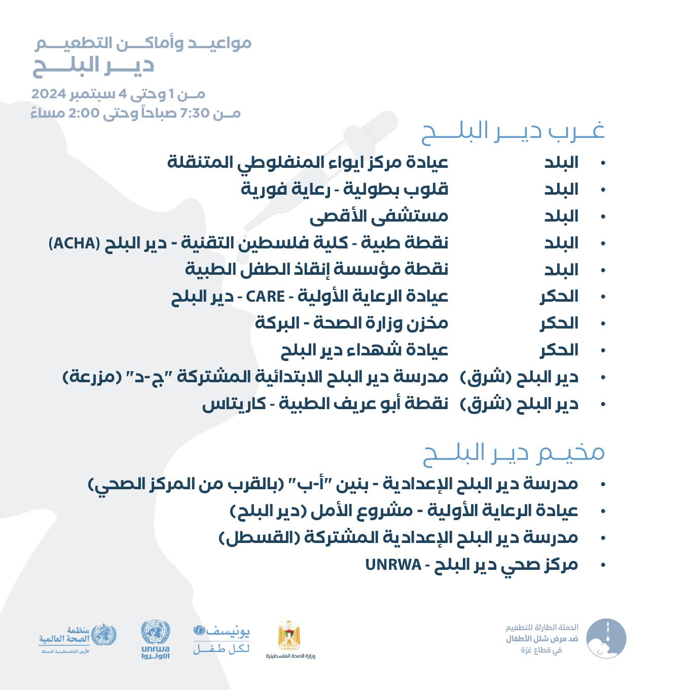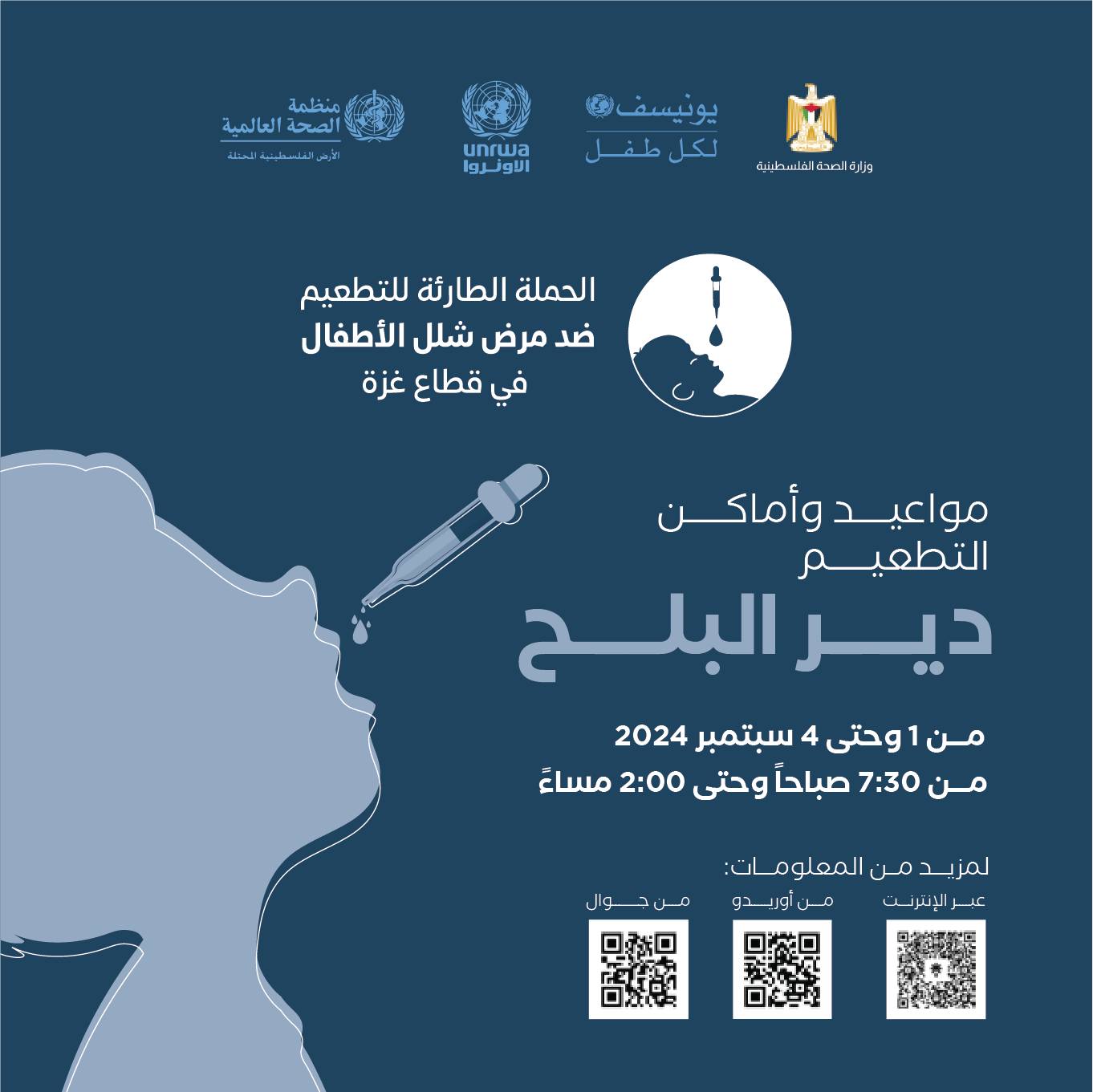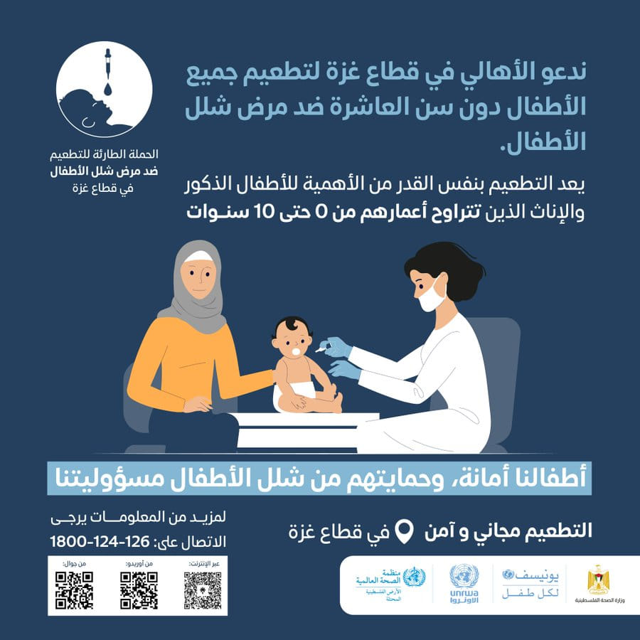 #الحملة الطارئة للتطعيم ضد شلل الأطفال من عمر 0-10 سنوات في اماكن النزوح حتى 4 سبتمبر 2024، من 7:30 صباحًا حتى 2:00 ظهرًا.