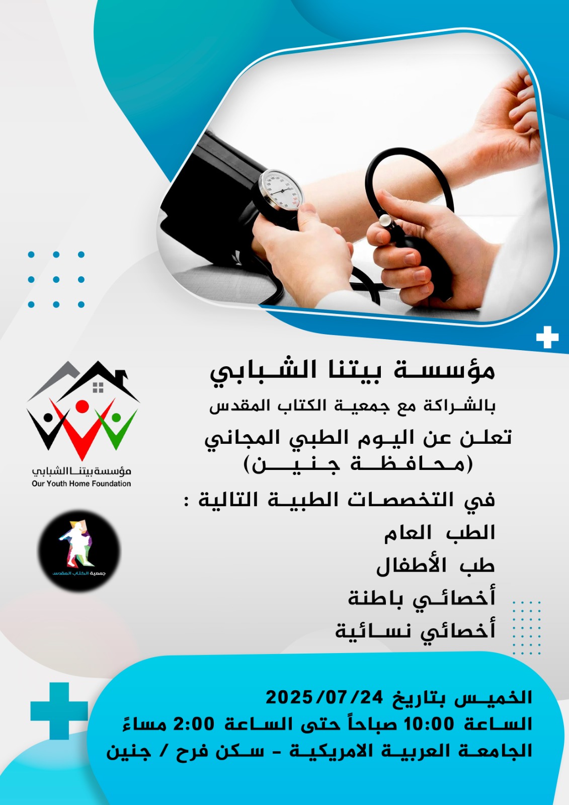 تعلن مؤسسة بيتنا الشبابي بالشراكة مع جمعية الكتاب المقدس عن تنظيم يوم طبي مجاني في محافظة جنين