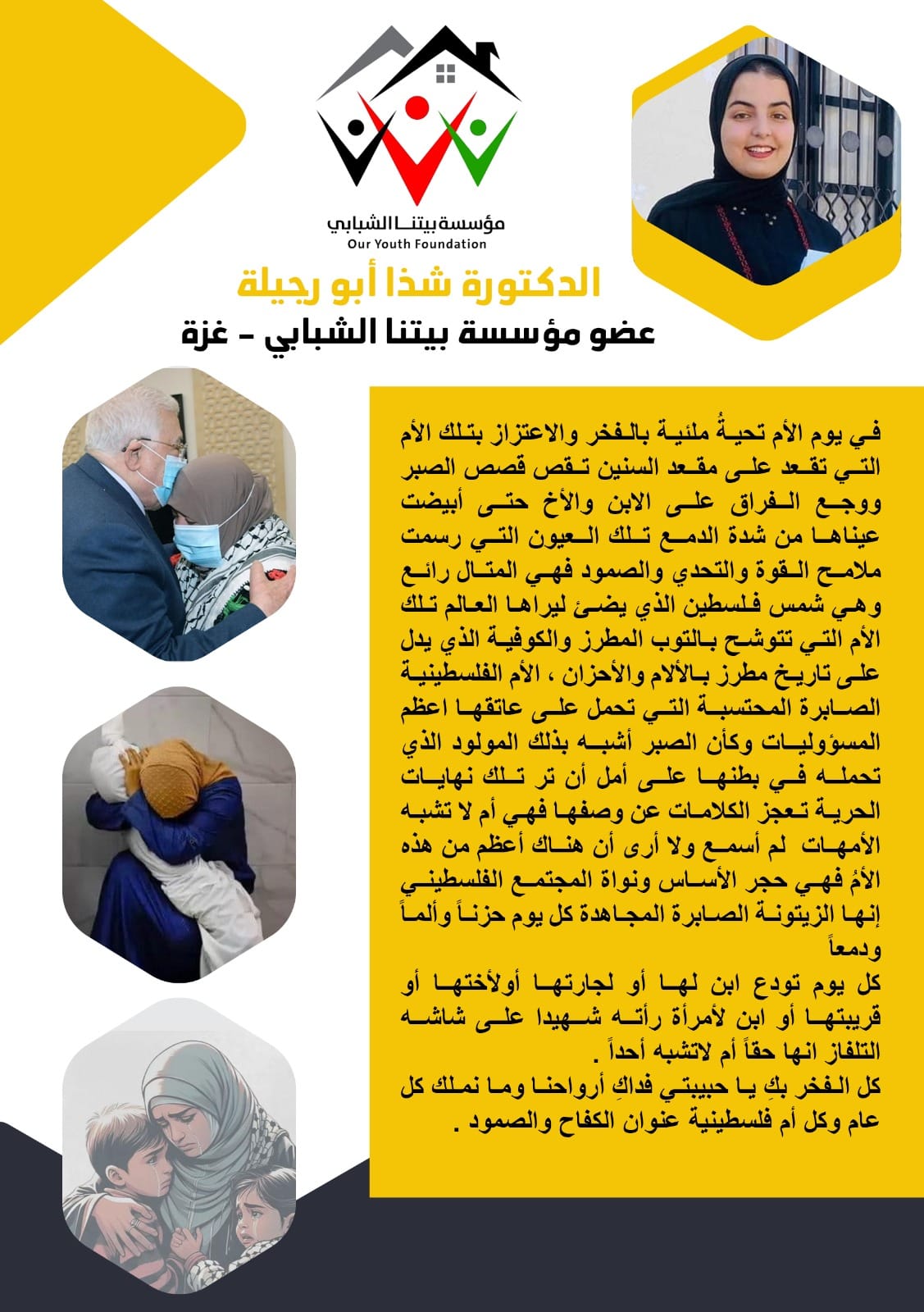 في #عيد_الأم ، كتبت الدكتورة شذا أبو رجيلة. عضو مؤسسة بيتنا الشبابي في قطاع غزة.