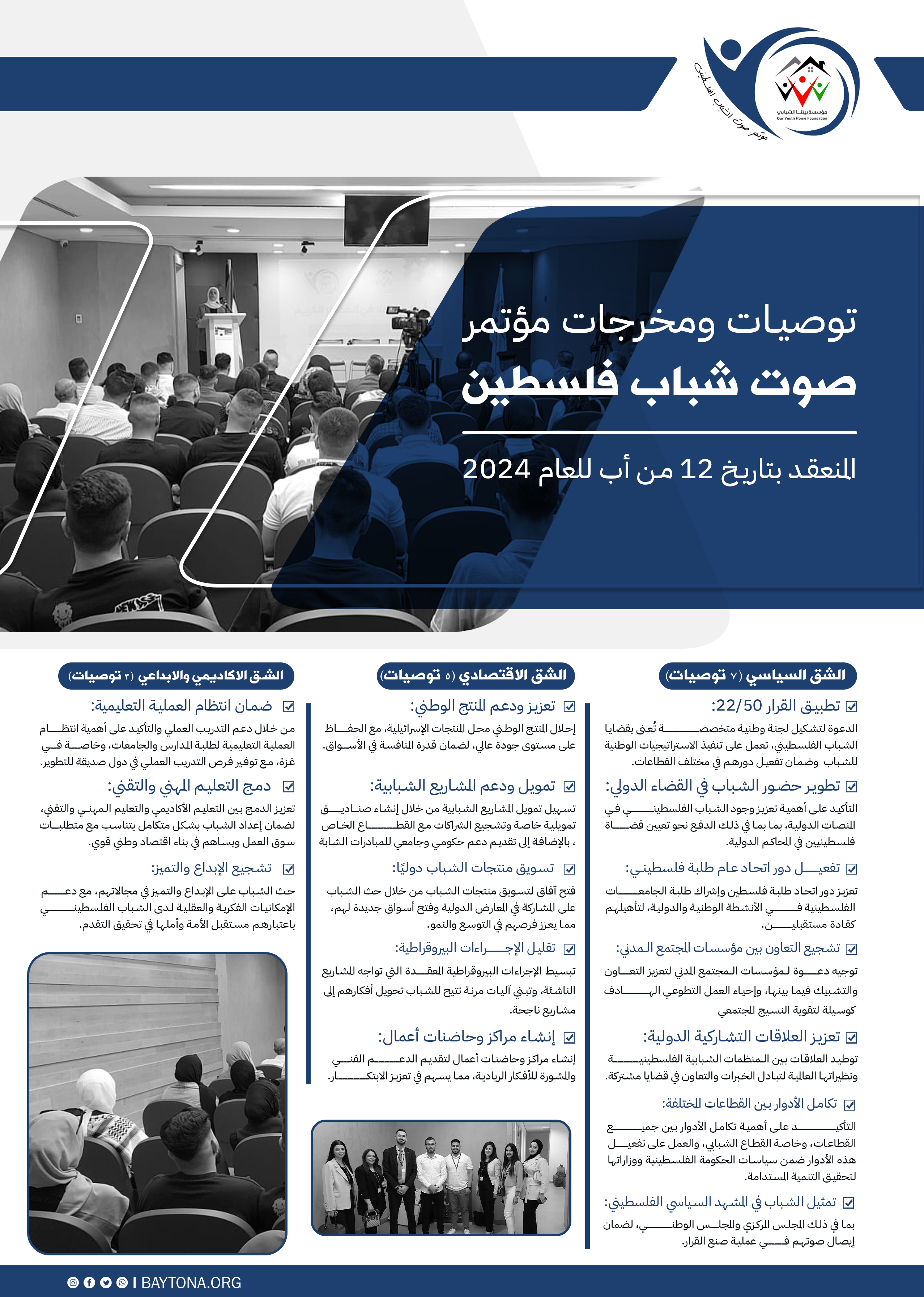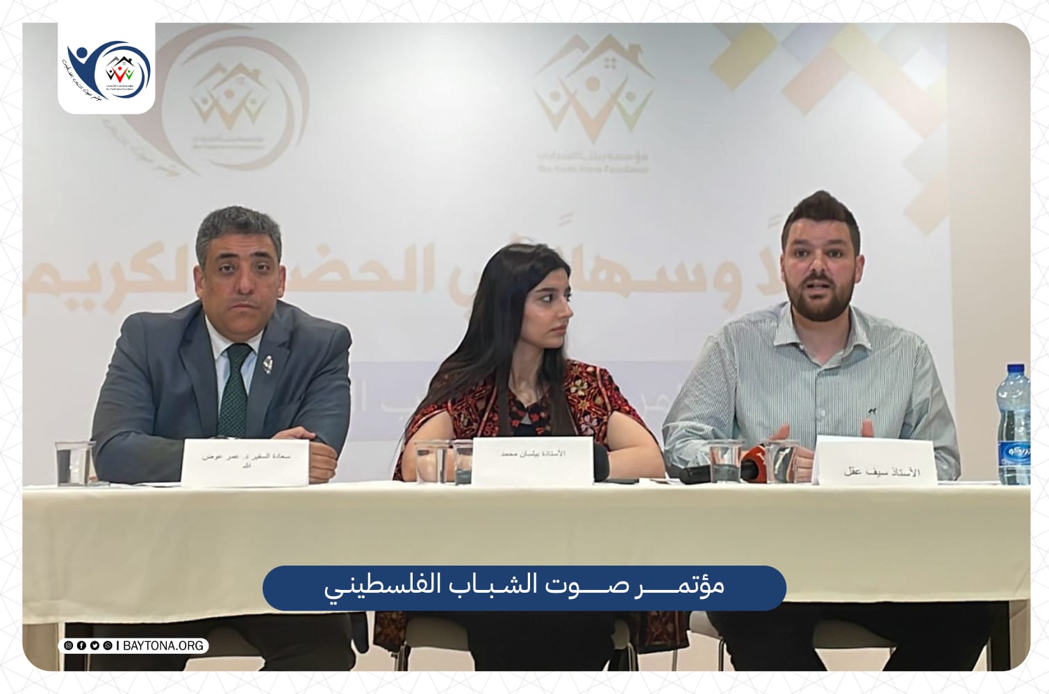 عُقدت فعاليات مؤتمر "صوت شباب فلسطين" بتنظيم من مؤسسة "بيتنا الشبابي" تزامنًا مع اليوم العالمي للشباب ، وذلك في قاعة متحف الشهيد ياسر عرفات بمقر المقاطعة بمدينة رام الله .